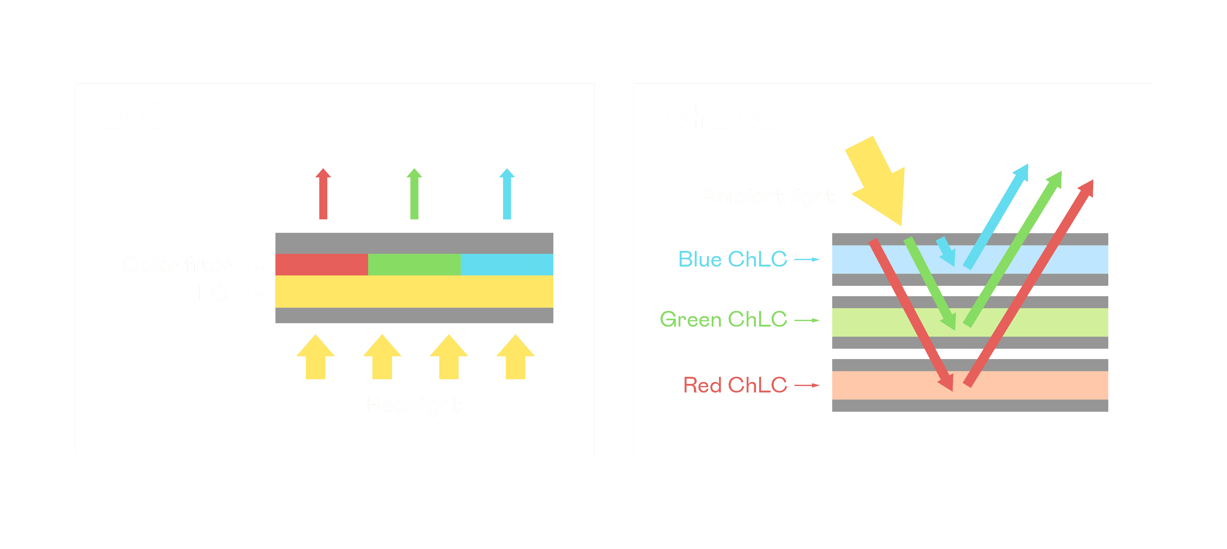 ChLCD 胆固醇液晶就如同纸张一样,,透过反射环境光来显示影像,,因此长时间观看不易造成人眼视觉疲劳,,可达到护眼效果。。当处于户外阳光下使用,,,,LCD 影像容易失真而不易观看,,但胆固醇液晶仍可维持较佳的影像品质。。。。